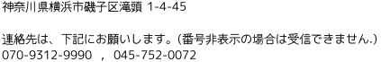 代表電話 :070-9312-9990 , 045-752-0072 (番号非表示の場合は受信できません。)