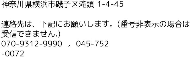 代表電話 :070-9312-9990 , 045-752-0072 (番号非表示の場合は受信できません。)